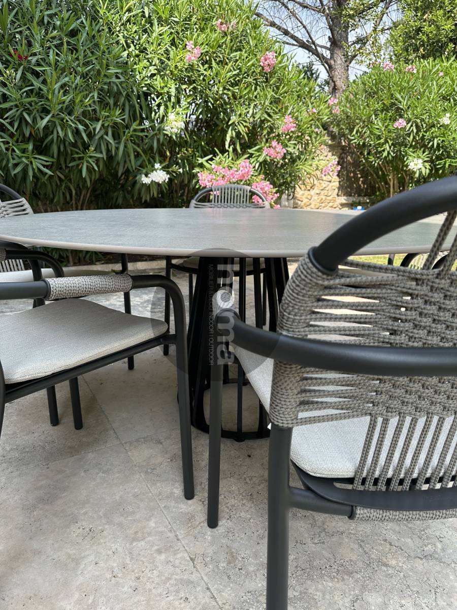 La base centrale de la table repas Furniz est conçue avec des lamelles galbées en aluminium epoxy résistant en extérieur toute l'année.
