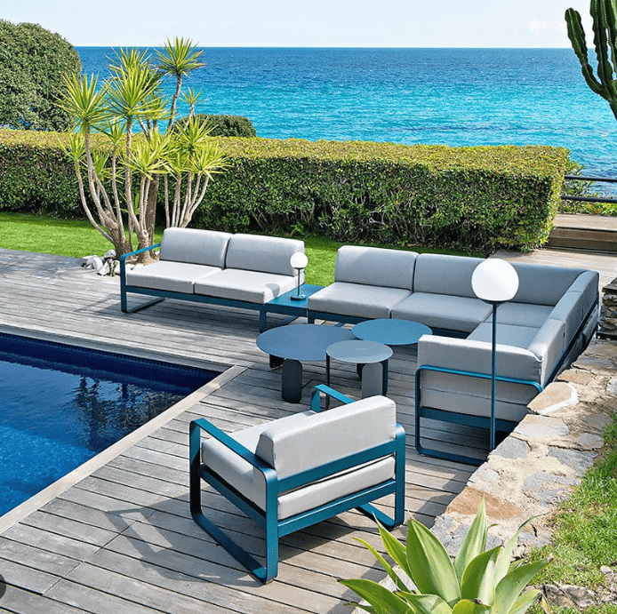 Ce canapé outdoor est garni de coussins déhoussables, hyper faciles d’entretien. Cela dit, passer par la case machine à laver ne s’avérera probablement pas nécessaire car le tissu 100% acrylique qui les recouvre, teint masse, résiste aux taches, à la moisissure, aux déchirures et à l’abrasion ! Un tissu Sunbrella®, par ailleurs ultra-doux, exclusif à Fermob.