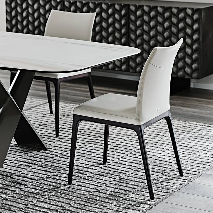 L'assise de la chaise Arcadia offre un choix entre cuir et tissu, deux options qui promettent confort et élégance. Le cuir apporte une touche de luxe et de sophistication, tandis que le tissu offre une palette de textures et de couleurs plus variée. Il est important de noter que l'assise n'est pas déhoussable, soulignant la qualité de fabrication et l'attention portée aux finitions.