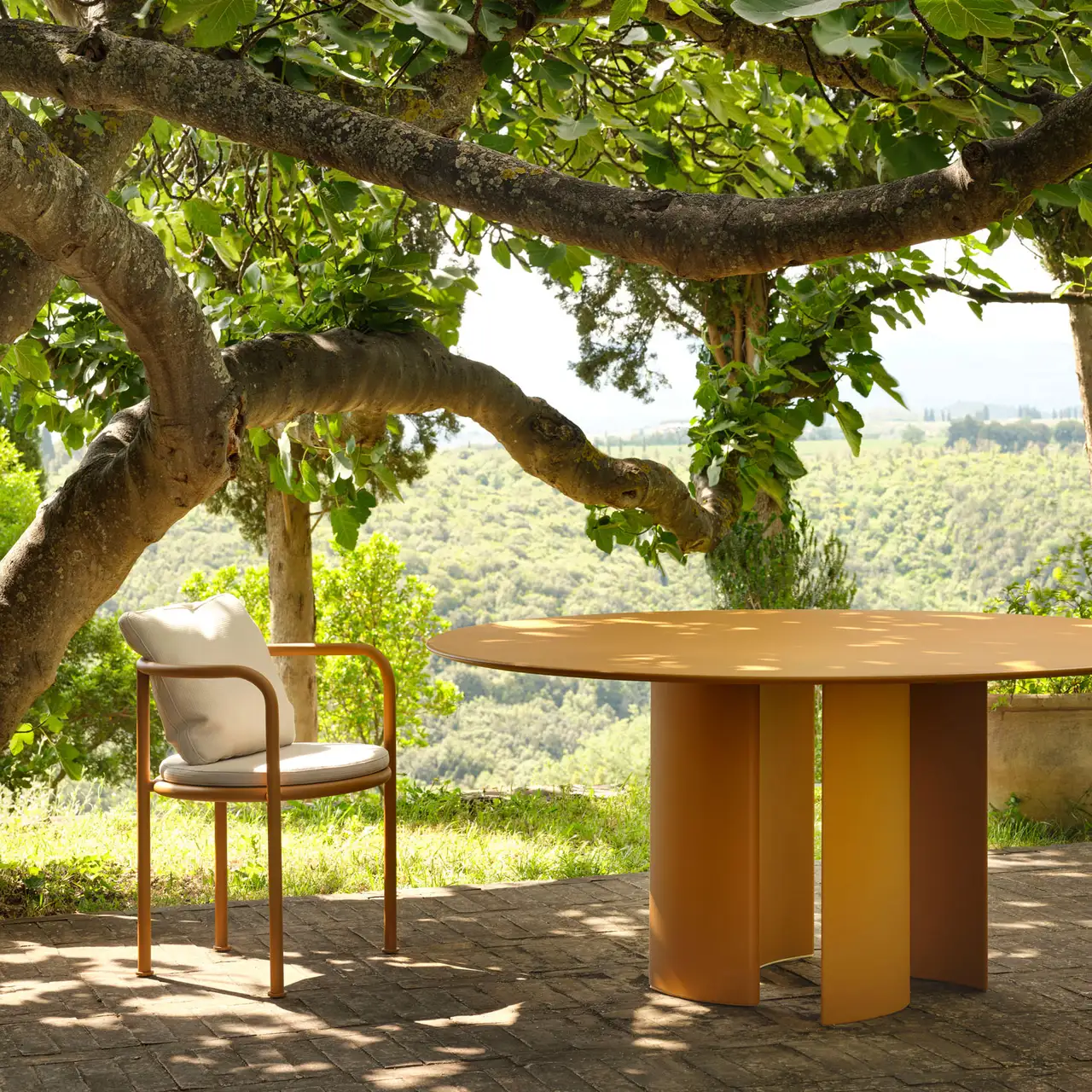 Disponible en deux diamètres généreux (138 cm et 165 cm), la table ronde Naca offre un espace de convivialité idéal pour vos moments de partage en plein air. Sa silhouette épurée s'exprime à travers une palette de finitions raffinées : Autumn Red, Mustard Yellow, Antique White ou Black, selon vos envies.